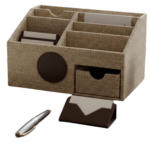 The set features a robust Desk Organizer with designated sections for pens, notepads, and mobile devices, ensuring a tidy workspace. Paired with it is a sleek Visiting Card Holder, designed to display your business cards prominently and professionally. The natural jute texture adds warmth and character to any corporate environment, making it a unique alternative to standard plastic or metal accessories.